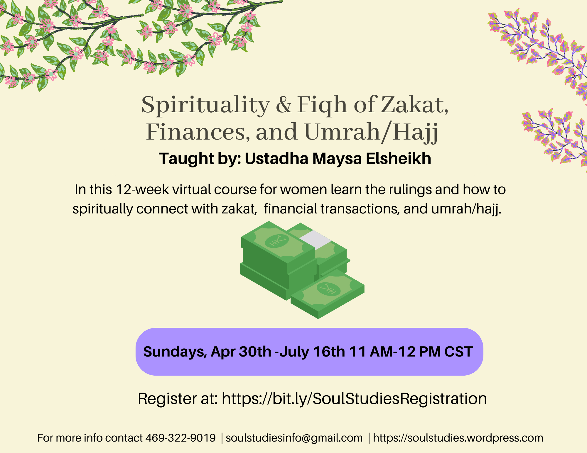 In this virtual class for ladies we will study the Hanafi fiqh of zakat, financial transactions and umrah/hajj. This class will include weekly quizzes to help students remember the rulings as well as reflective activities to connect more deeply spiritually to these acts of worship.