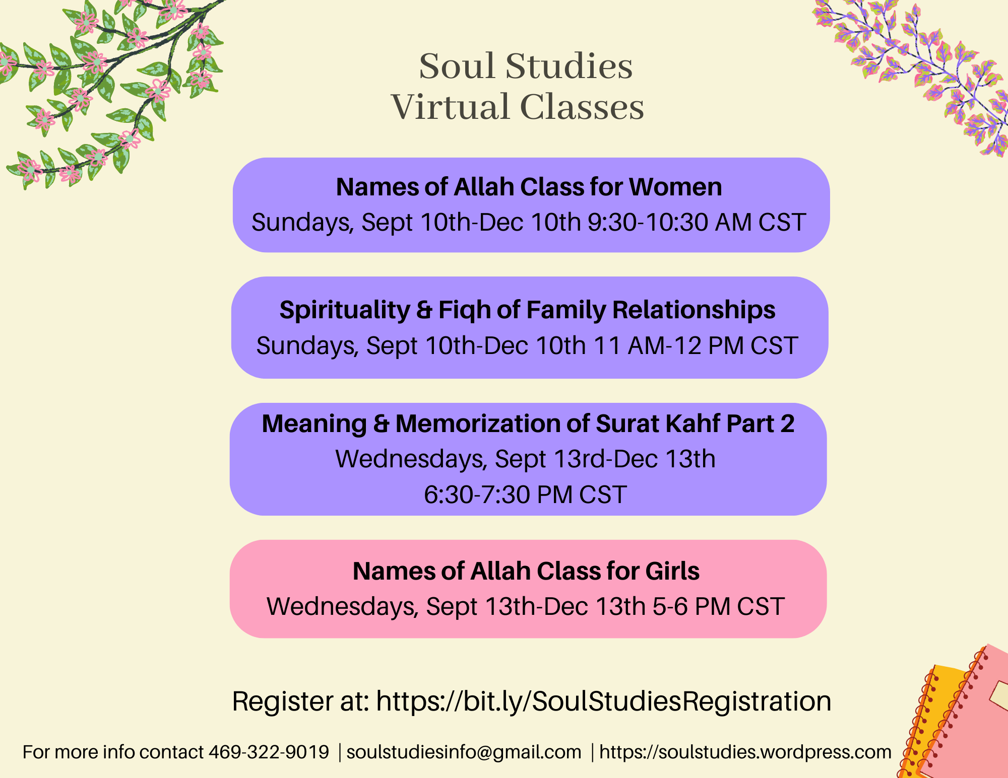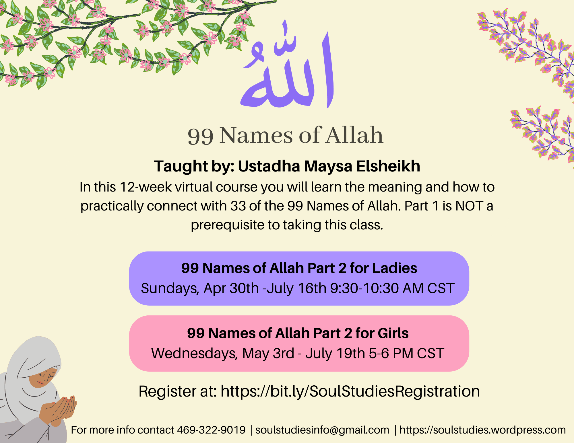 In this 12-week virtual class for ladies we will explore 33 names of Allah, memorize them, and deeply reflect on how to embrace them in our daily lives. Part 1 and/or 2 are NOT a prerequisite to taking this class.