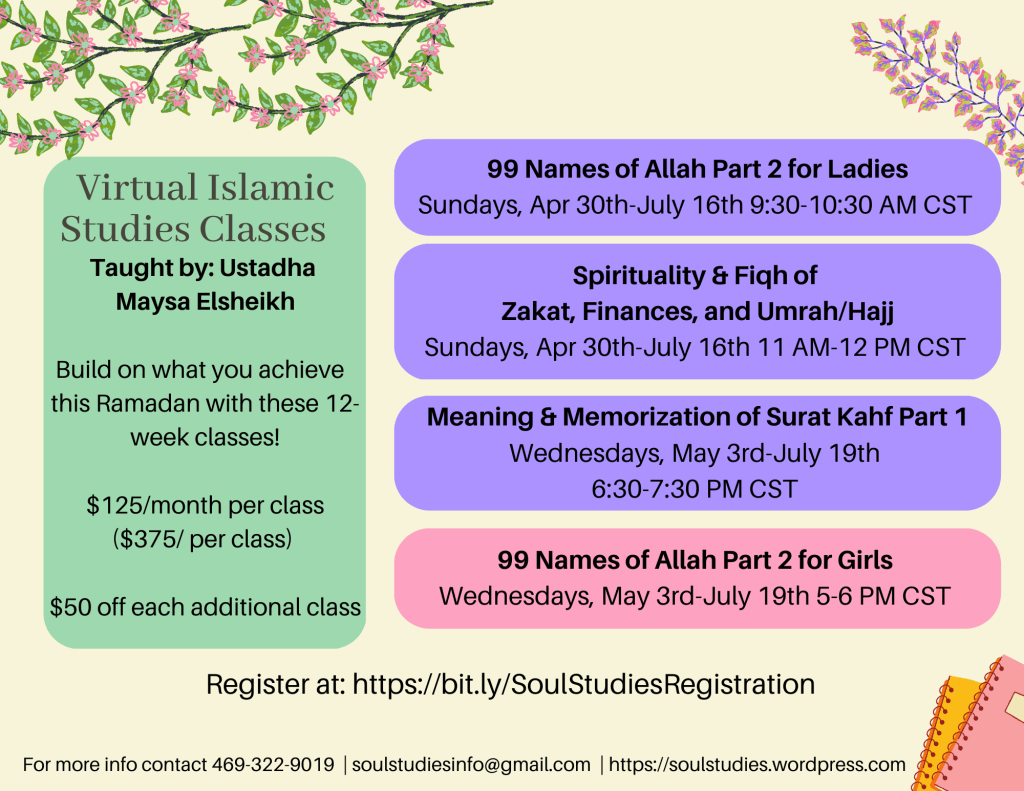 In this 12-week virtual class for ladies we will explore 33 names of Allah, memorize them, and deeply reflect on how to embrace them in our daily lives. Part 1 is NOT a prerequisite to taking this class.