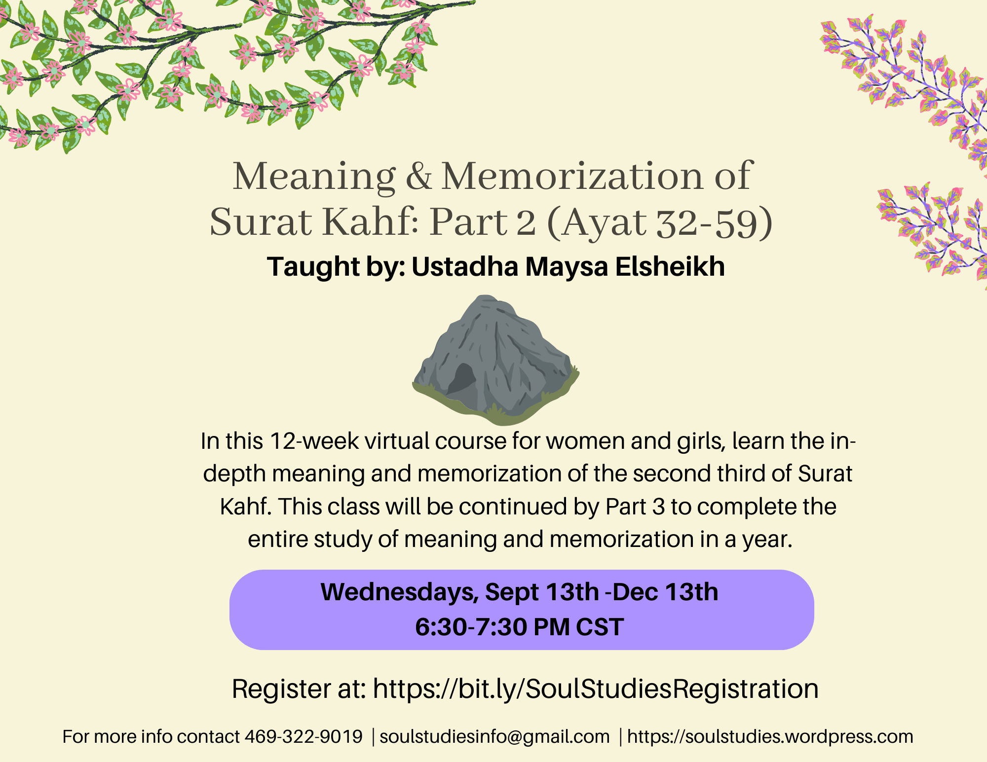 In this 12-week virtual course for women and girls, learn the in-depth meaning and memorization of the second third of Surat Kahf. This class will be continued by Part 3 to complete the entire study of meaning and memorization in a year.